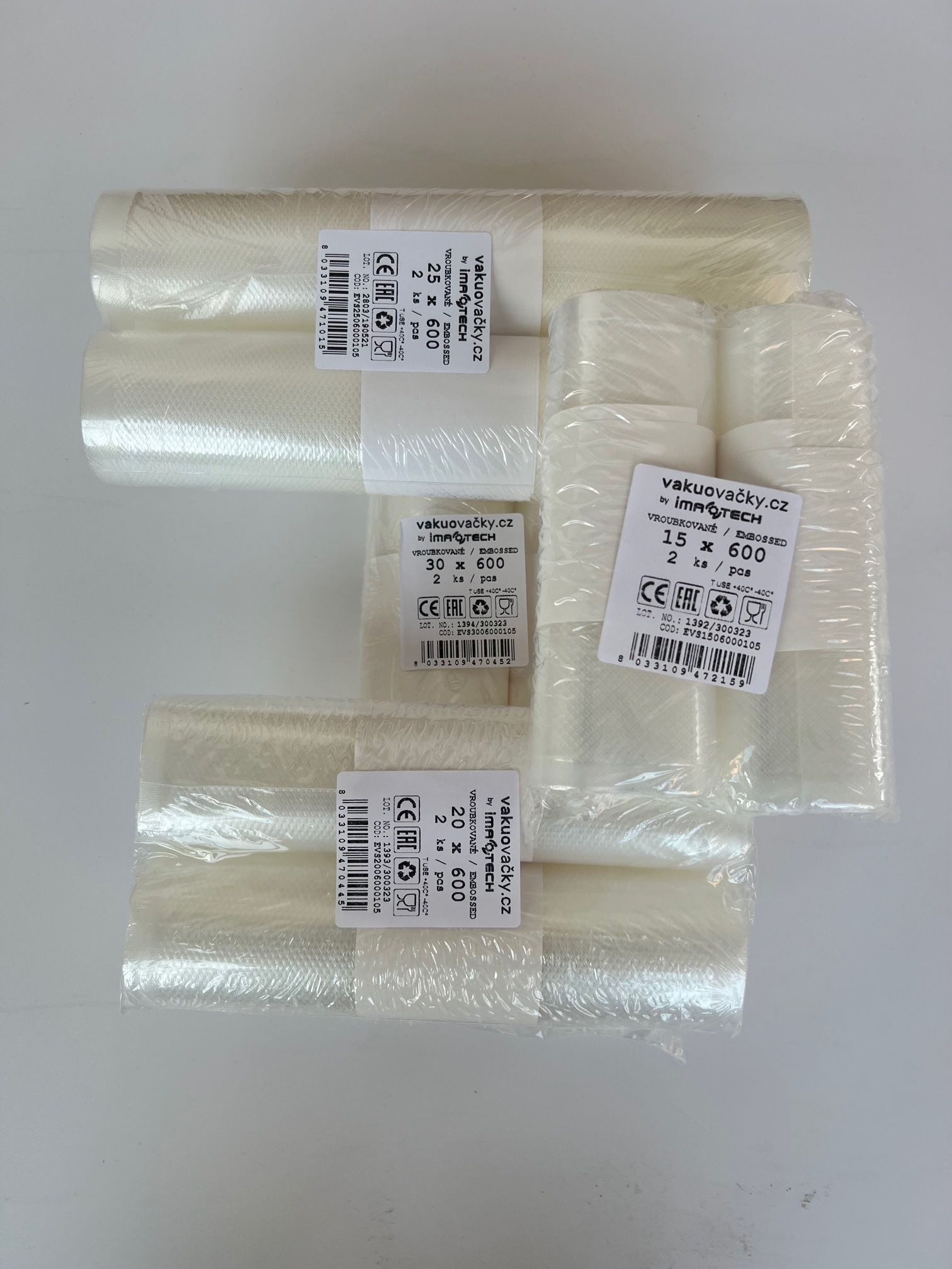 Ein Set gerändelter Vakuumrollen aus deutschem PA/PE-Material mit den Maßen : 150 x 6.000 mm (2 Stk.), 200 x 6.000 mm (2 Stk.), 250 x 6.000 mm (2 Stk.), 300 x 6.000 mm (2 Stk.). Eine Packung enthält 8 Rollen, d.h. 48 m. Der Preis gilt für 8 Stück in einer Packung.