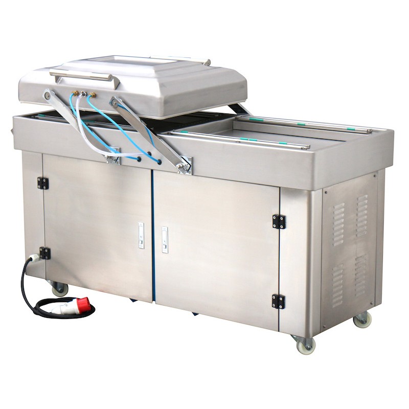 Einfach zu bedienender Verpacker aus Edelstahl mit zwei Kammern und einem aufklappbaren Deckel.