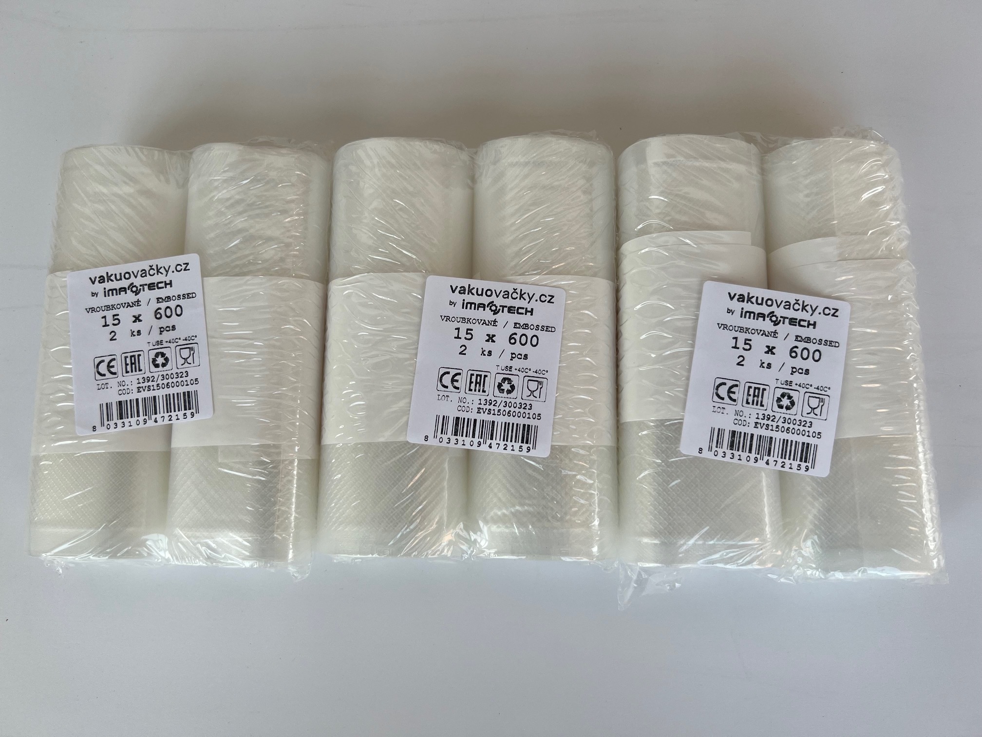Gerändelte Vakuumrolle aus deutschem PA/PE-Material mit den Maßen 150 x 6.000 mm. Eine Packung enthält 6 Rollen, d.h. 36 m. Der Preis gilt für 6 Stück in einer Packung.
