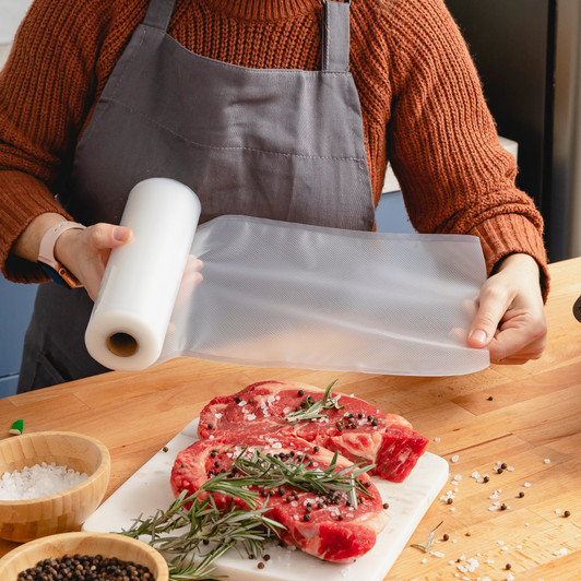 Gerändelte Vakuumrolle aus deutschem PA/PE-Material mit den Maßen 300 x 6.000 mm. Eine Packung enthält 2 Rollen, d.h. 12 m. Der Preis gilt für 2 Stück in einer Packung.